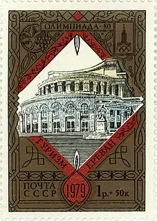 - Почтово-благотоворительный выпуск «Туризм под знаком Олимпиады в СССР». На марке (ЦФА [АО «Марка»] № 4995) — Ереван. Театр оперы и балета им. А. Спендиарова, многоцветная. Глубокая печать в сочетании с металлографией, перфорирована: комбинированная рамочная зубцовка 12:11½ (на каждые 2 сантиметра края марки приходится 12:11½ зубцов). В марочных листах 25 (5×5) и малые листы (кляйнбогены) по 16 (4×4) марок[7][32][34].