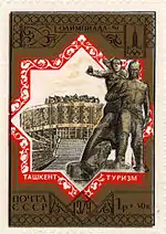 - Почтово-благотоворительный выпуск «Туризм под знаком Олимпиады в СССР». На марке (ЦФА [АО «Марка»] № 4990) — Ташкент. Монумент «Мужество», многоцветная. Глубокая печать в сочетании с металлографией, перфорирована: комбинированная рамочная зубцовка 12:11½ (на каждые 2 сантиметра края марки приходится 12:11½ зубцов). В марочных листах 25 (5×5) и малые листы (кляйнбогены) по 16 (4×4) марок[7][32][34].