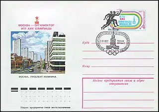 - Почтово-благотоворительный выпуск «Туризм под знаком Олимпиады в СССР». На марке (ЦФА [АО «Марка»] № 5052) — Москва. Проспект Калинина, многоцветная. Глубокая печать в сочетании с металлографией, перфорирована: комбинированная рамочная зубцовка 12:11½ (на каждые 2 сантиметра края марки приходится 12:11½ зубцов). В марочных листах 25 (5×5) и малые листы (кляйнбогены) по 16 (4×4) марок[8][36][39].