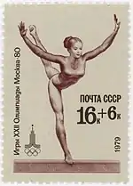 - Почтово-благотоворительный выпуск Игры XXII Олимпиады. Москва-80. На марке (ЦФА [АО «Марка»] № 4950) — спортивная гимнастика, упражнения на бревне, многоцветная. Офсетная печать, перфорирована: комбинированная гребенчатая зубцовка 12:12½ (на каждые 2 сантиметра края марки приходится 12:12½ зубцов). В марочных листах 36 (6×6) и малые листы (кляйнбогены) по 20 (5×4) марок[7][28][30].