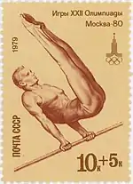 - Почтово-благотоворительный выпуск Игры XXII Олимпиады. Москва-80. На марке (ЦФА [АО «Марка»] № 4949) — спортивная гимнастика, перекладина, многоцветная. Офсетная печать, перфорирована: комбинированная гребенчатая зубцовка 12:12½ (на каждые 2 сантиметра края марки приходится 12:12½ зубцов). В марочных листах 36 (6×6) и малые листы (кляйнбогены) по 20 (5×4) марок[7][28][30].