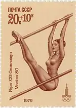 - Почтово-благотоворительный выпуск Игры XXII Олимпиады. Москва-80. На марке (ЦФА [АО «Марка»] № 4951) — спортивная гимнастика, разновысокие брусья, многоцветная. Офсетная печать, перфорирована: комбинированная гребенчатая зубцовка 12:12½ (на каждые 2 сантиметра края марки приходится 12:12½ зубцов). В марочных листах 36 (6×6) и малые листы (кляйнбогены) по 20 (5×4) марок[7][28][30].