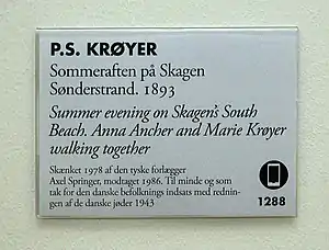 - P.S. Krøyer 1851-1909 "Sommeraften ved Skagen Sønderstrand. Anna Ancher, t.v. og Marie Krøyer". 1893. Kunstnyt.dk. Дата обращения: 26 мая 2015.