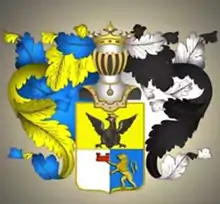В щите, разделённом надвое, в верхней половине в золотом поле изображен чёрный орёл с короною на главе. В нижней половине, в левом голубом поле виден золотой лев, держащий на одной передней правой лапе в серебряном поле красную крепость с двумя башнями.