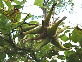Тычиночные серёжки длиной до 14 см, повислые, скучены по 2—5, с шелковистыми острыми чешуями.