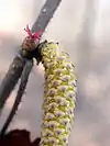 Слева направо: Листья. Мужская серёжка. Плод. | ||||||||||