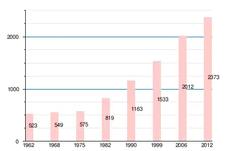 | 1962 | 1968 | 1975 | 1982 | 1990 | 1999 | 2005 | 2006 | 2010 | 2011 | 2012 |