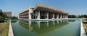 В 1950 году по приглашению индийских властей штата Пенджаб Корбюзье приступил к осуществлению самого масштабного проекта своей жизни — проекта новой столицы штата, города Чандигарх. Город, включающий административный центр, жилые кварталы со всей инфраструктурой, школы, гостиницы и пр., строился в течение примерно десяти лет (1951—1960, достраивался на протяжении 1960-х гг.). Сотрудничали с Ле Корбюзье в проектировании Чандигарха архитекторы из Англии, супруги Максвелл Фрай и Джейн Дрю, а также Пьер Жаннере (брат Корбюзье), — три Главных архитектора, которые осуществляли надзор за строительством. С ними работала также большая группа индийских архитекторов во главе с М. Н. Шарма[17].