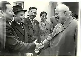 ![]() Н.С.Хрущев в колхозе «Политотдел», слева Ким М.В., в центре Хван Ман Гым, Любовь Ли. | |
