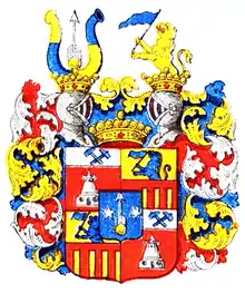 На гербе баронская корона и по бокам её два шлема с баронскими же коронами. На правом шлеме две трубы, полу-золотые, полу-голубые; между ними золотой шар, и над ним серебряная стрела, острием вверх. Из левого шлема выходит вправо обращенный лев, держащий в правой лапе голубое знамя. Намет попеременно золотой и серебряный, подложенный голубым и красным.