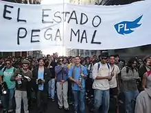 В мае 2011 года члены партии приняли участие в Конопляном марше в Буэнос-Айресе под лозунгом «Государство — это плохая поездка» (исп. El Estado pega mal).[18] Либеральная либертарианская партия поддерживает легализацию марихуаны, утверждая, что государство должно уважать индивидуальные действия до тех пор, пока они не наносят ущерба свободе другого человека.[6][19] Партия утверждает, что запрет нарушает статью 19 Конституции.[20] Они также потребовали снять обвинения с Матиаса Фарая, который был задержан за культивацию каннабиса.[20][21]