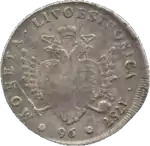 | Описание | Совмещённые гербы Российской империи и двух губерний и надпись «MONETA · LIVOESTHONICA · 1757 ✸ 96 ✸» |