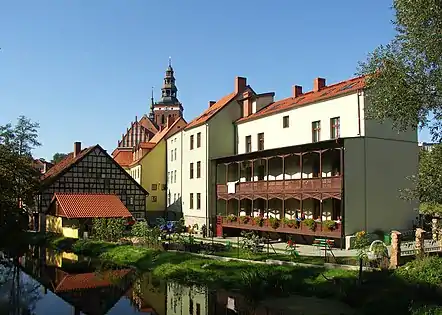 Строительство каменного замка было начато в 1348 году. Замок и примыкающая к нему южная предзамковая часть, так называемое «предзамчье», окружённый высокими стенами и укреплённые глубоким рвом, создают уникальный архитектурный ансамбль. Он причислен к архитектурным памятникам мирового класса. Свою историческую резиденцию строили три очередных епископа: Ян I из Мисьни, Ян II Стрыпроцк и Генрых III Сорбом, с 1350 по 1401 год. Скоро она стала центром их светской и религиозной власти. Замок построен на плане квадрата. Он прост и сдержан. Углы венчают тянущиеся к свету три четырёхгранные стрельчатые башенки. Четвёртая башня была приспособлена к обороне замка. Главный вход в замок находится в южной стороне. Ведёт он на квадратный внутренний двор, окружённый двухэтажными арочными галереями.