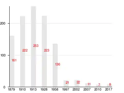 Число жителей по семейным спискам 1879 г.: 70 м. п., 91 ж. п.; по приходским сведениям 1879 г.: 61 м. п., 82 ж. п.[2]