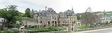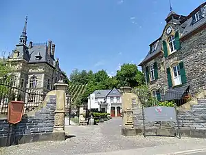 Фасады зданий протянулись с востока на запад. Доступ во все номера на разных этажах осуществляется через центральный коридор (типичная особенность английских загородных особняков). Первый этаж возводили из красноватого песчаника, а верхние этажи — из типичного для этого региона сланцевого камня. Оконные проёмы на верхних этажах выполнены из удельфангерского песчаника, а все колонны и опоры созданы из бургпреппахерского песчаника. Крыша также покрыта сланцевым шифером, который добывали в шахтах Каубера.