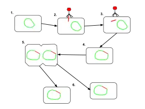 Когда репрессор образует контур поддержания собственного синтеза, ДНК фага встраивается в геномную ДНК бактерии. Встраивание обеспечивается белковым продуктом гена int, который также входит в лизогенный регуляторный контур[8].