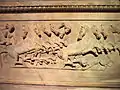 Саркофаг украшен барельефами, боковые барельефы изображают охоту на львов и кабанов, а барельефы в конце изображают сражающихся кентавров и сфинксов.[1]