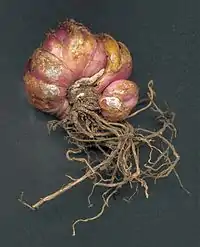 Луковица почти округлая, до 10 см в диаметре, желтовато-пурпурно-коричневая; чешуи свободно покрывают друг друга, ланцетные, в верхней части заострённые.