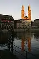 Вид на реку Лиммат в Старом городе Цюриха с моста Квайбрюке летом 2020 года | |