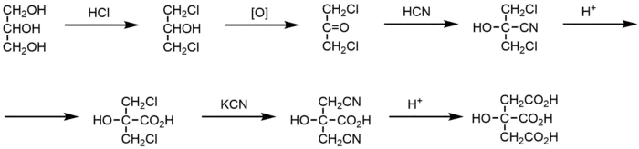 Впервые лимонную кислоту химическим синтезом получили Гримо (Grimaux) и Адам (Adam) в 1880 году. Исходным соединением в этом синтезе послужил глицерин. Первичные гидроксильные группы молекулы глицерина сначала замещали на атомы хлора, а затем на нитрильные группы, которые при гидролизе давали концевые карбоксильные группы. Вторичную же гидроксильную группу окисляли до кетогруппы, к которой затем присоединяли циановодород; полученный циангидрин также при гидролизе давал карбоксильную группу[10].