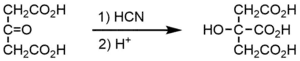 В 1891 году лимонную кислоту получили присоединением синильной кислоты к моноэтиловому эфиру ацетондикарбоновой кислоты с последующим гидролизом. Правда, само исходное вещество было изначально получено из лимонной кислоты[12].