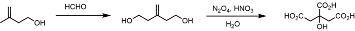 В 1980 году лимонную кислоту получили по реакции конденсации 3-метилбутен-3-ола-1 и формальдегида с последующим окислением полученного продукта диоксидом азота[16][15].