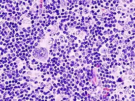 Лимфома Ходжкина (синонимы: лимфогранулемато́з[10][11], болезнь Ходжкина, злокачественная гранулёма) — злокачественное заболевание лимфоидной ткани, характерным признаком которого является наличие гигантских клеток Рид — Березовского — Штернберга, обнаруживаемых при микроскопическом исследовании поражённых лимфатических узлов.