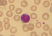 Подкрашенный по методу Романовского — Райта лимфоцит, окружённый эритроцитами (вид в оптический микроскоп)