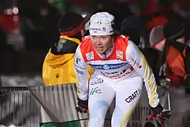 Использует лыжи и ботинки производства фирмы Madshus.