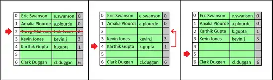 Таким образом, при очистке ячейки i необходимо просмотреть последующие ячейки, пока не найдём пустую ячейку, либо ключ, который можно перенести в ячейку i (то есть ключ, хеш-значение которого равно или меньше i). Если найдена пустая ячейка, то можно очистить ячейку i и остановить процесс удаления. Если же найден ключ, который можно перенести в ячейку i, переносим его. Это приведёт к увеличению скорости поиска перенесённого ключа, а также очищает другую ячейку в блоке занятых ячеек. Необходимо продолжить поиск ключа, который может быть перенесён на это освободившееся место. Поиск ключа для переноса осуществляется до пустой ячейки, пока не достигнем ячейки, которая изначально была пуста. Таким образом, время выполнения всего процесса удаления пропорционально длине блока, содержащего удалённый ключ[3].