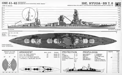 | Исэ (яп. 伊勢) | Верфь Кавасаки, Кобе | 10 мая 1915 | 12 ноября 1916 | 15 декабря 1917 | 28 июля 1945 в результате бомбовых попаданий затонул у заводской стенки в Куре с креном 20 градусов на правый борт. 4 июля 1946 г. поднят и разобран в Хариме. |