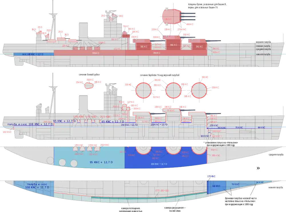 Пояс — 330…356 мм; носовые траверзы — 305…203 мм; кормовые траверзы — 254…102 мм; палуба — 159…95 мм; башни ГК — 406 мм (лоб), 280—229 мм (борт и тыл), 184 мм (крыша); барбеты башен ГК — 381…305 мм; башни среднего калибра — 38…25 мм, барбеты — 25 мм; рубка — 356…254 мм, крыша — 165 мм |