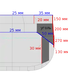 Противоторпедная переборка имела толщину в 30 мм, увеличиваясь в районе погребов до 50 мм. Дополнительную конструктивную защиту обеспечивали угольные бункеры[8].