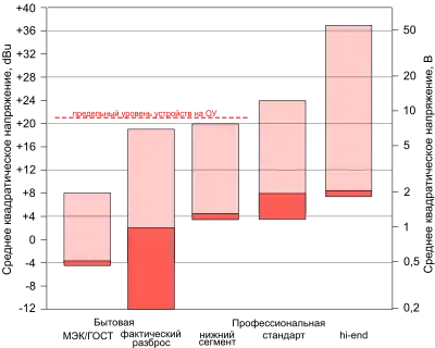 - 20 дБ и более — в студийных цифровых рекордерах, профессиональных микшерских пультах и процессорах сигнала[17];