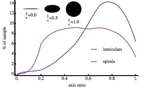 Меру выраженности балджа можно оценить как отношение большой и малой оси видимого диска галактики. Для этого параметра в промежутке от 0,25 до 0,85 распространённость линзовидных галактик увеличивается, в то время как для спиральных остаётся неизменной[3]. Несмотря на то, что этот параметр не всегда связан с реальной формой галактики (например, если галактика наблюдалась плашмя, отношение в любом случае будет близко к 1), общая тенденция видна.