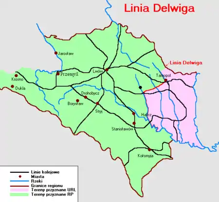 Линия Дельвига, установленная по фактическому положению польско-украинского фронта, проходила через Заложцы — р. Серет — Тернополь — Остров — Литятин — р. Золотая Липа — р. Днестр — Незвиско[3].