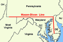Линия Мэйсона — Диксона (англ. Mason–Dixon Line) — граница, проведённая в 1763—1767 годах английскими землемерами и астрономами Чарльзом Мэйсоном и Джеремайей Диксоном для разрешения длившегося почти век территориального спора между британскими колониями в Америке: Пенсильванией и Мэрилендом.[1] Линия чётко определила границы современных американских штатов Пенсильвания, Мэриленд, Делавэр и Западная Виргиния. До гражданской войны линия Мэйсона — Диксона служила символической границей между свободными от рабства штатами Севера и рабовладельческими штатами Юга[1].