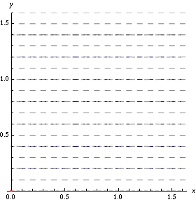 - синяя линия соответствует «треку»[1] (англ. streakline): (изменяющейся) линии, которую увидит наблюдатель, если из начала координат непрерывно выпускать струйку синих чернил.