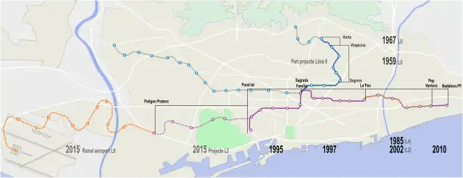 - 31 декабря 1995 года: продление линии на один участок от станции "Сант-Антони" до станции "Парал-лэл".