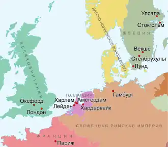 Весной 1735 года Линней отправился в Нидерланды (Республику Соединённых провинций, больше известную как Голландская республика по наиболее крупной её провинции), чтобы получить степень доктора медицины (со второй половины XVII века защита докторской диссертации именно в Нидерландах была для выпускников шведских университетов распространённым явлением)[11]. Часть денежных средств, необходимых для поездки, он получил от своего будущего тестя[16][~ 1], часть — от одного из своих друзей в Фалуне: Линней должен был сопровождать в заграничной образовательной поездке его сына[18].