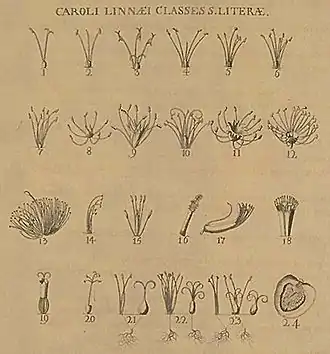 - Species plantarum («Виды растений», 1753, в двух томах). Опыт с использованием nomina trivialia, начатый в работе Pan Svecicus (1749), Линней применил в этой работе ко всем известным на тот период растениям. Для каждого вида была приведена огромная синонимика из работ предшествующих ботаников (именуемых теперь «долиннеевскими»). Эта работа окончательно закрепила ранее высказывавшееся Линнеем мнение о том, что именно вид является основой в биологической систематике[13]. Условная дата опубликования работы, 1 мая 1753 года (в действительности второй том вышел в августе этого года), принята за исходный пункт ботанической номенклатуры.