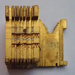 Линотипные матрицы и клинья в составе набранной строки