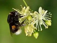Цветки правильные, обоеполые, с двойным пятираздельным околоцветником, до 1—1,5 см в диаметре, желтовато-белые, пахучие, собраны в повислые щитковидные соцветия по 3—11 штук, при соцветиях имеется продолговатый желтовато-зелёный прилистник. Тычинок в цветке много. Цветёт с начала июля 10—15 дней[11] (по фенологическому календарю начинает цвести на 79-й день после зацветания орешника). Нектароносная ткань, расположенная на внутренней части оснований чашелистиков, выделяет 5—10 мг нектара[11]. В густых насаждениях начинает цвести в возрасте 20—25 лет, а на открытой местности — в 12—15[12].