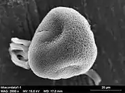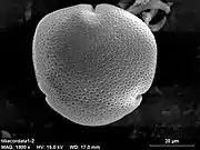 Пыльцевые зёрна трёхбороздные, шаровидно-сплющенной формы. Длина полярной оси 25,5—28,9 мкм, экваториальный диаметр 32,3—35,8 мкм. В очертании с полюса почти округлые, с экватора — эллиптические. Борозды щелевидные, короткие, видны только под иммерсионным объективом. Оры продольно вытянутые, с неровными краями, глубоко погруженные, с наибольшим диаметром 10,5—11 мкм; оровая мембрана гладкая или мелкозернистая. Ширина мезопориума 23,5—28,1 мкм. Толщина экзины в центре мезопориума 2,2 мкм, около ор 8 мкм; верхний слой экзины, слегка выклиниваясь, прикрывает ору. Стерженьковый слой имеет толщину 0,8—1 мкм, стерженьки прямые или узловатые, с округлыми или сплющенными головками. Ячейки угловатые или овальные, образующиеся в результате слияния стенок стерженьков или их головок; наибольший диаметр ячеек 1,2 мкм, наименьший — 0,5 мкм. Цвет пыльцы светло-жёлто-зелёный[11].