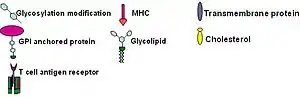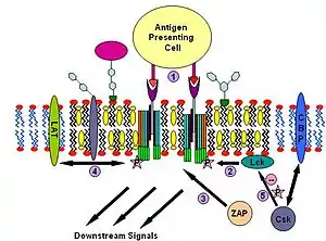 Т-клеточный антигеновый рецептор (TCR) — это молекула, имеющаяся на поверхности Т-лимфоцитов (Т-клеток). Он включает в себя αβ-гетеродимер, CD3- (γδε) комплекс и ξ-гомодимер. α- и β-субъединицы содержат внеклеточные сайты связывания для пептидов, которые представлены на белках главного комплекса гистосовместимости (МНС) I и II классов, расположенных на поверхности антигенпрезентирующих клеток (APC). CD3- и ξ-субъединицы содержат цитоплазматические мотивы ITAM. При передаче сигнала молекулы MHC связываются с TCR, соединяя два или более рецептора вместе. Такое соединение рецепторов, как и в сигнальном пути IgE, рекрутирует дважды ацетилированные нерецепторные Src-подобные тирозинкиназы для фосфорилирования мотивов ITAM. TCR привлекает не только тирозинкиназу Lyn, но и Fyn[23][33]. После этого белок ZAP-70, не участвующий в сигнальном пути IgE, связывается с фосфорилированными ITAM, благодаря чему активируется сам и активирует LAT. Активация LAT даёт амплификацию сигнала. Другое отличие сигнального пути TCR от сигнального пути IgE заключается в том, что TCR активируют белок Lck, что может приводить к более сильной кластеризации рафтов[34][35] и тем самым дополнительно усиливать сигнал. Одним из возможных механизмов отрицательной регуляции этого пути может быть связывание цитозольной киназы Csk с ассоциированным с рафтами белком CBP. После этого Csk может подавлять работу киназ семейства Src через фосфорилирование[36].