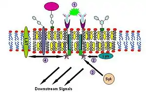 Последовательность событий этого сигнального пути такова. Сначала IgE связывается с Fc-эпсилон рецепторами, находящимися в плазматических мембранах тучных клеток и базофилов, через их Fc-сегмент. Тетрамер FcεR состоит из одной α-, одной β- и двух γ-цепей[28]. Сначала один тетрамер FcεR связывается с одной молекулой IgE. С IgE связывается α-цепь, а три другие цепи содержат активационный тирозиновый мотив иммунных рецепторов (англ. immune receptor tyrosine-based activation motifs (ITAM)). Далее олигомерный антиген связывается с несколькими молекулами IgE, уже связанным к тому моменту с FcεR, сшивая вместе два или более рецепторных комплексов. После такого соединения для фосфорилирования ITAM двух рецепторов привлекается дважды ацетилированная нерецепторная Src-подобная тирозинкиназа Lyn. Далее тирозинкиназа семейства Syk связывается с фосфотирозиновыми остатками ITAM (результат работы Lyn) и начинает сигнальный каскад[26][27]. Syk, в свою очередь, может активировать другие белки, например, LAT. Белки LAT, связываясь друг с другом, могут рекрутировать в рафт другие белки и дополнительно амплифицировать (усиливать) сигнал[32].