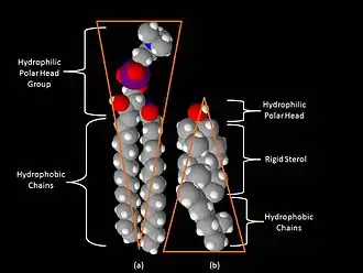 Холестерин служит динамическим «клеем», который скрепляет липиды рафта воедино[5] и заполняет все пустоты между ними. Из-за жёсткой природы стерольной группы холестерин предпочтительнее располагается в рафтах, где длинные насыщенные ацильные хвосты сфинголипидов могут образовывать более компактные и прочные связи с его кольцевой системой, чем более короткие и часто ненасыщенные хвосты фосфолипидов окружающего бислоя. По этой причине липидные рафты являются менее жидкими по сравнению с остальным бислоем[2].