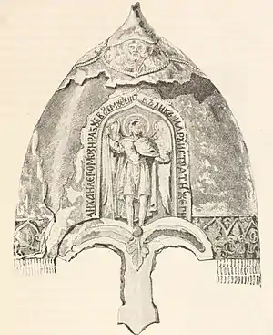 9 августа 1808 года крестьянки Анисья Ларионова и Настасья Васильева из села Лыково, расположенного неподалеку от Юрьева-Польского[5], «находясь в кустарнике для щипания орехов, усмотрела близ орехового куста в кочке что-то светящееся». Это «что-то» оказалось древним позолоченным шлемом, под которым лежала свёрнутая кольчуга. Шлем был богато украшен и содержал надпись: "Великий архистратиг Господень Михаил, помоги рабу своему Феодору".