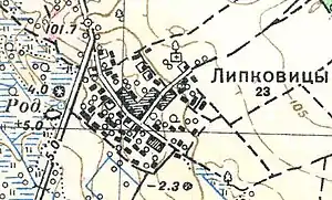 ЛИПКОВИЦЫ — деревня владельческая при пруде, число дворов — 16, число жителей: 52 м. п., 55 ж. п.; Часовня. (1862 год)[14]