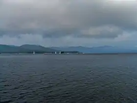 ![]() Липовская гора с южного берега озера Тургояк. Вдалеке — Заозёрный хребет и Варганова гора | |